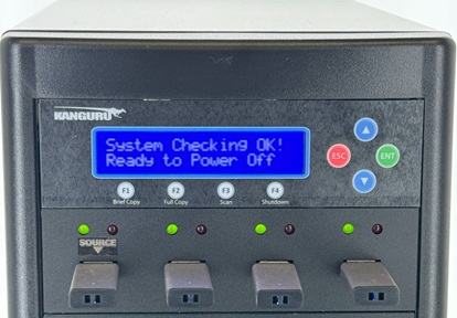The Kanguru USB Duplicators contain a shutdown function. This function will save any system settings that have been configured since the device was last powered on, to make sure that it is safe to power down the system. Turning off the duplicator without performing this function will increase the risk of damaging the system.