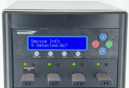 Note: If you have all the USB ports on the duplicator full, the duplicator will start the process automatically for you. If however you do not have a USB drive connected to every port you will see a message stating X Detect, Go? (x represents the drives detected) and will need to press ENT to continue.