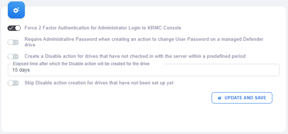 - To force 2FA for all administrators on your account you will need to navigate to Settings and selecting Administrative Settings and enable “Force 2 Factor Authentication for Administrator Login to KRMC Hosted Console” and select the Update and SAVE button. Note: Force 2FA is only available on Advanced and Premium KRMC Hosted accounts.