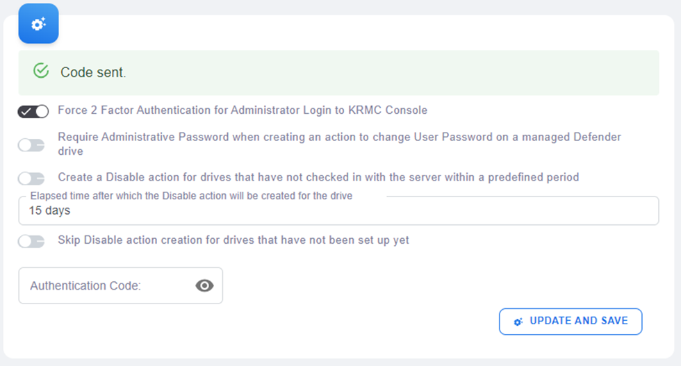 - After the code has been entered, select the VERIFY button. You will know that the 2FA setup has been completed as you will receive a message on KRMC Hosted stating “Administrative Settings Updates” and the Authentication Code field will be blank.