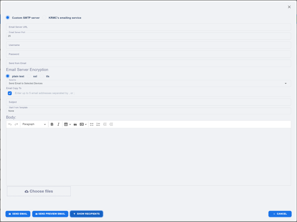 | Email Server | Emails can be sent either from KRMC’s default emailing service or the user’s own custom SMTP server. If Custom SMTP Server is selected, then you will need to fill out the required server information. |