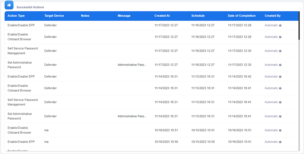 Successful Actions contains a list of actions that were successfully executed on the target device. Actions on this page cannot be deleted. There is an additional Date of Completion column in Successful Actions that records the date and time that the action was executed.