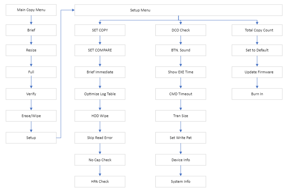 Hard Drive Tower Duplicator - Menu Diagram Matthew Buckley Updated August 28, 2024 20:31 Follow For more information on the Kanguru Hard Drive Tower Duplicator, please refer to the User Manual located at HERE. Comments 0 comments Please sign in to leave a comment.